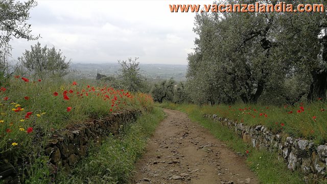 Imbocchiamo al termine del paese la strada verde per Anchiano contraddistinta dal segnavia 14. Targhe con citazioni leonardesche e tanti fiori colorati, ma soprattutto distese a perdita d'occhio di ulivi ci accompagnano in questa passeggiata, lievemente in salita all'inizio e poi più dolce e in piano nel suo proseguire. Nonostante sia piovuto tantissimo, la carrabile è percorribile a piedi e per fortuna il terreno ha drenato bene da non rischiare di infangarsi... sono comunque consigliabili scarpe sportive!