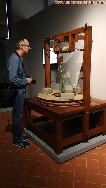 Entriamo all'interno del Castello per visitare la mostra allestita su più piani (stesso biglietto cumulativo) chiamata “alle Origini del Genio” (15 aprile – 15 ottobre 2019). In questa esposizione si possono ammirare modelli che riproducono progetti di Leonardo da Vinci di macchine da cantiere, ma anche invenzioni belliche e i primi esperimenti del volo, fino ad arrivare a quelli che furono le sue opere legate alle chiuse, progetti ancora attuali soprattutto in Lombardia (vi consigliamo di leggere il nostro itinerario “Ecomuseo Adda di Leonardo”).