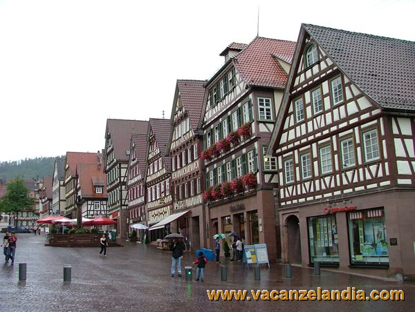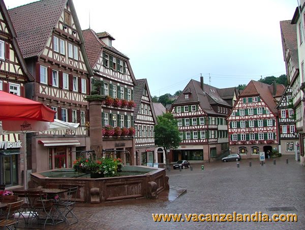Ore 15.00 ripartiamo, direzione Calw che dista circa 45 km. Percorriamo la HOCHSCHWARZWALD-STRASSE, anche se il brutto tempo non ci fa ammirare appieno il paesaggio. Verso le 16.00 sotto ad una pioggia battente arriviamo a CALW (m 347 s.l.m.), sostiamo in area attrezzata con corrente a pagamento. Attendiamo che la pioggia si plachi un po' e poi usciamo a visitare questa deliziosa cittadina situata nella stretta valle del fiume Nagold. E' famosa per le case a graticcio..... in effetti quasi tutti gli edifici che si affacciano sulle vie del centro storico sono le tipiche case con le scandole in legno. Calw è famosa anche per aver dato i natali allo scrittore Hermann Hesse (1877-1962), premio nobel per la letteratura nel 1946, a ricordo di lui si trova pure una fontana.