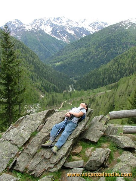 mappa_trentino_alto_adige_val_rabbi_3aNotte fresca (minima 10°C) e silenziosissima. Ci alziamo con calma e fuori splende un bel sole. Ci prepariamo per un'escursione. Ore 10.40 zaini in spalla ci incamminiamo sul sentiero che costeggia il torrente Rabbies.