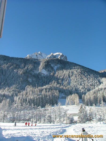 Stanotte raggiungiamo il minimo storico di temperature (-22°C)!!! Il nostro camper ha retto bene all'impatto di freddo...meno male! Abbiamo la cornice in alluminio della porta d'entrata tutto ghiacciato... Fuori splende un sole meraviglioso e così dopo colazione, ben vestiti, ce ne andiamo a fare una bella passeggiata. Siamo immersi in un paesaggio da cartolina! Raggiungiamo a piedi la frazione di MOSO (BZ – MOOS) e da lì possiamo godere di uno scenografia stupenda delle Dolomiti di Sesto.