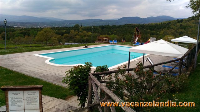 La zona ci era già nota, fu la prima vacanza che realizzammo con il camper, era il lontano ponte di Ognissanti del 2002 (leggi diario di viaggio - clicca QUI), la ricordavamo molto bella, paesaggi incantevoli dove la natura è rigogliosa e affascinante, zona ricca di storia e religiosità. È il Parco Nazionale delle Foreste Casentinesi, meglio conosciuto come il Casentino, uno stupendo lembo di terra che si estende tra le regioni della Toscana e dell'Emilia Romagna. Ma torniamo alla location, che avevamo scelto. L'agricampeggio la Collina delle Stelle sorge su un poggio, l'antico casale del '600 ristrutturato nel rispetto della tradizione storica ospita l'agriturismo, il ristorante e gli spazi comuni accessibili ed utilizzabili anche dai camperisti, quindi area bimbi, area relax, piscina e sale di lettura e conviviali. Esteticamente parlando, nulla dato al caso, tutto in perfetto stile, armonioso e soprattutto quel rustico che "non stanca", ma ti accoglie! Semplice, ma bello che sembra uscito da una pubblicità, Poi che dire? Ti guardi attorno e il paesaggio incornicia scenograficamente la struttura da farti sentire già bene, una proiezione a 360° sulle colline circostanti dove in lontananza spunta il castello di Poppi, il nucleo abitativo di Bibbiena e all'orizzonte il complesso del Santuario di La Verna, luogo di spiritualità legato alla vita di San Francesco. Poco distante si trova anche l'Eremo di Camaldoli, luogo d'arte e di fede.