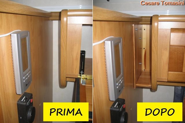 I pensili non sono cambiati, ma ne è stato rinforzato l’attacco alle pareti e sono state montate guarnizioni sugli sportelli per limitare rumore e usura. Riguardo al rinforzo del mobilio alle pareti: è stata una necessità per tutti i mobili, visto che tendevano tutti a staccarsi, sicuramente per la bassa rigidità del telaio originale. A tal proposito, presso un’officina specializzata ho fatto rinforzare il telaio esterno e il collegamento tra questo e la struttura, mentre presso un’altra officina autorizzata ho fatto modificare leggermente l’angolazione dei bracci delle sospensioni per permettere loro di essere più morbide sugli ostacoli.