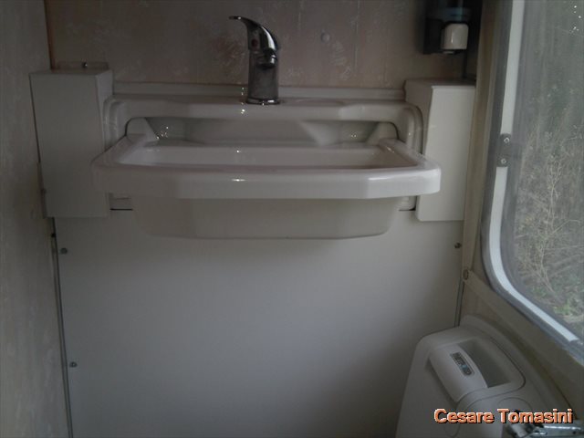 Parliamo quindi del vano toilette, nel quale – oltre al riposizionamento del lavabo – sono stati ricavati un mobiletto a parete e uno a giorno; il rubinetto del lavabo è stato sostituito da un normale miscelatore di qualità “brico”, mentre il comando alla pompa dell’acqua viene dato da un pulsante a pavimento: in questo modo le mani sono libere e l’acqua viene solo quando richiesta, con notevole riduzione dei consumi!