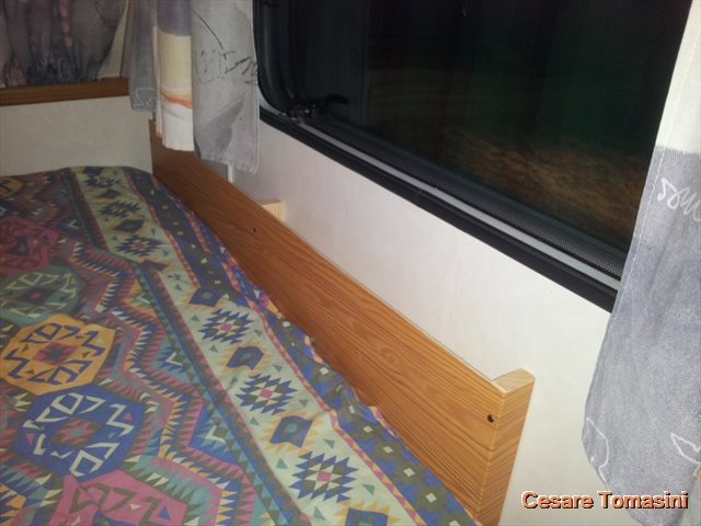 Tornando all’interno, la parte anteriore è stata rivoluzionata per un uso di coppia: ho creato una piccola dinette a due posti, esattamente sull’asse ruote, affiancata da un semi-letto matrimoniale con doghe, materasso “serio” e paretine anticondensa. In questo modo il letto si completa in modo molto veloce e senza sforzo, inoltre solo la parte terminale delle gambe appoggia su cuscini “standard” mentre il grosso del corpo appoggia su un vero letto, con un incremento inimmaginabile del comfort, e con una misura di tutto rispetto di 160 x 190 cm; chiaramente questa modifica l’abbiamo fatta quando siamo rimasti soli mia moglie ed io e quindi non aveva più senso tenere una dinette grande. Mi ha fatto molto piacere vedere che recentemente la Trigano stessa ha proposto la medesima soluzione!