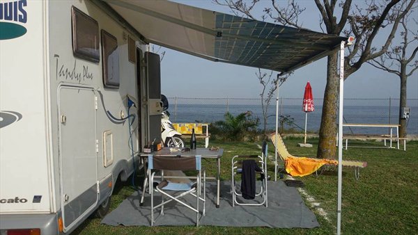 Arriviamo verso le 14 e possiamo apprezzare subito la gentilezza dei gestori, chiamo perché il tom tom ci indica di girare in quello che sembra più un sentiero di campagna, e arriva subito il padre di Tea che ci guida per la strada giusta. L’area non è lussuosa ma la piazzola che mi attende superiore ad ogni aspettativa, siamo elevati rispetto al mare e si ha proprio l’impressione di essere immersi dentro!