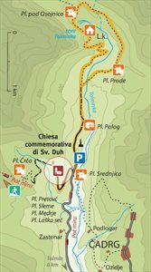 C’è da dire che il viaggio è abbastanza difficoltoso. Nel senzo che la chiesa, che si trova all’interno del parco del Triglav, si raggiunge tramite la statale che passa da Zatolmin (SLO) e che finisce ad un piccolissimo parcheggio, o meglio dire uno slargo (ci stanno appena 3 macchine), che dista circa 5-6 Km dal campeggio. Dopo di che inizia una strada bianca che in altri 7 km porta ad un altro piccolo parcheggio sotto la chiesa del Santo Spirito.